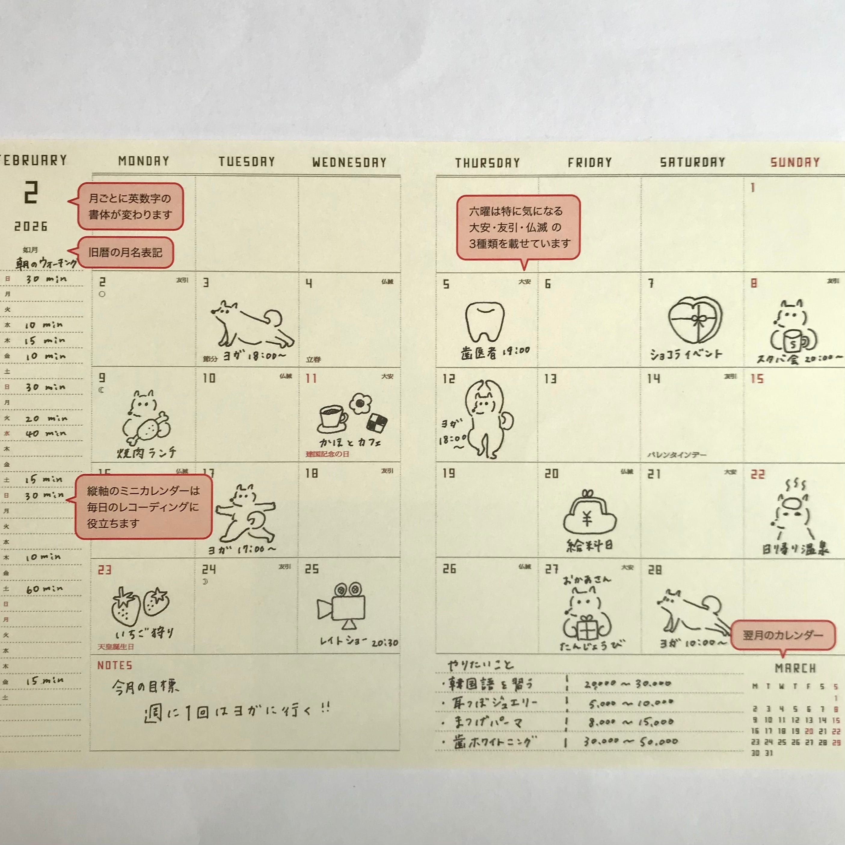 シンプルなレイアウトながら、毎月のフォントが変わるので月初めは新鮮な気分に。