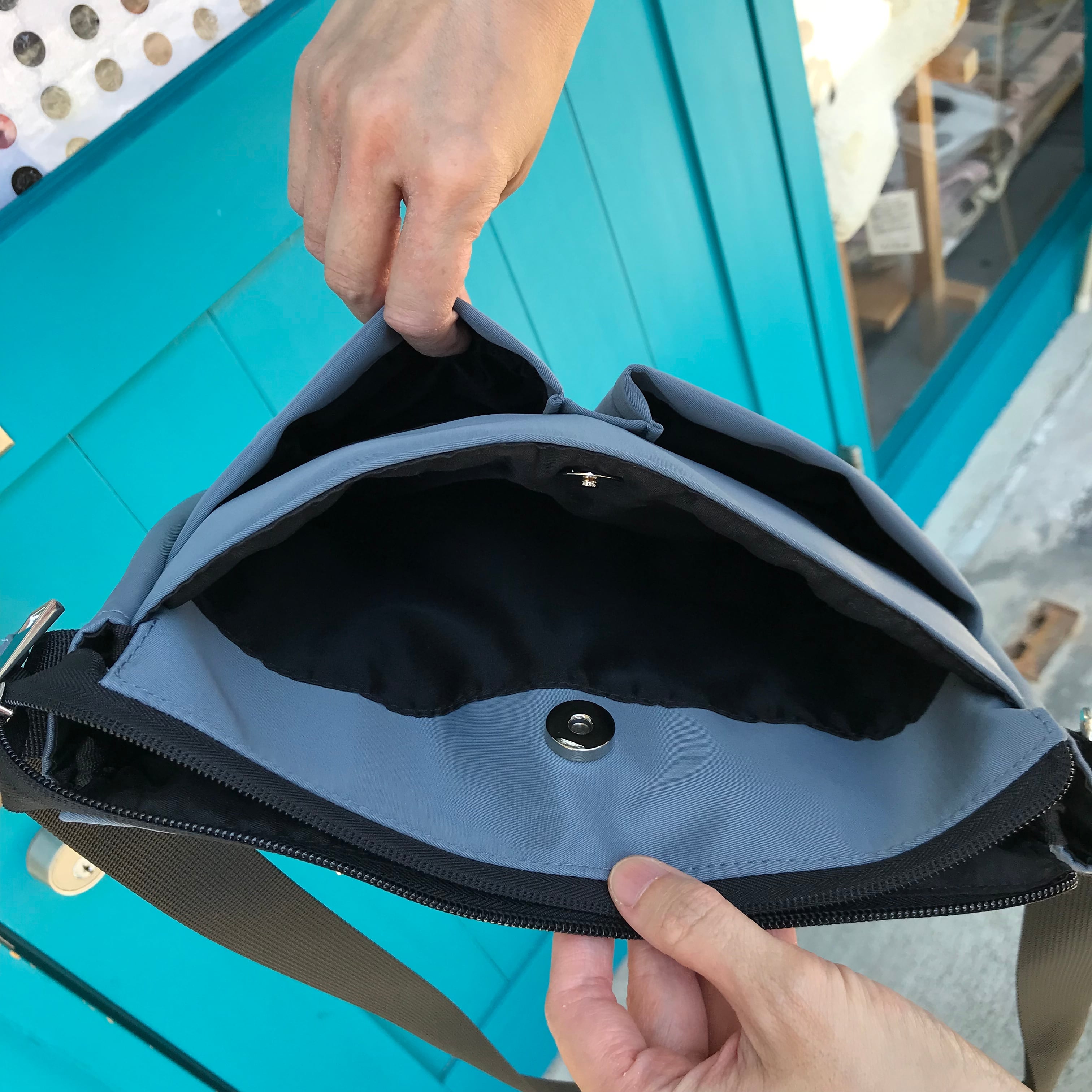 外側の表にはオープンポケット2つ、マグネット釦付きポケットが1つ。裏側にはマグネット釦付きポケットが1つ、ファスナーポケットが1つ。